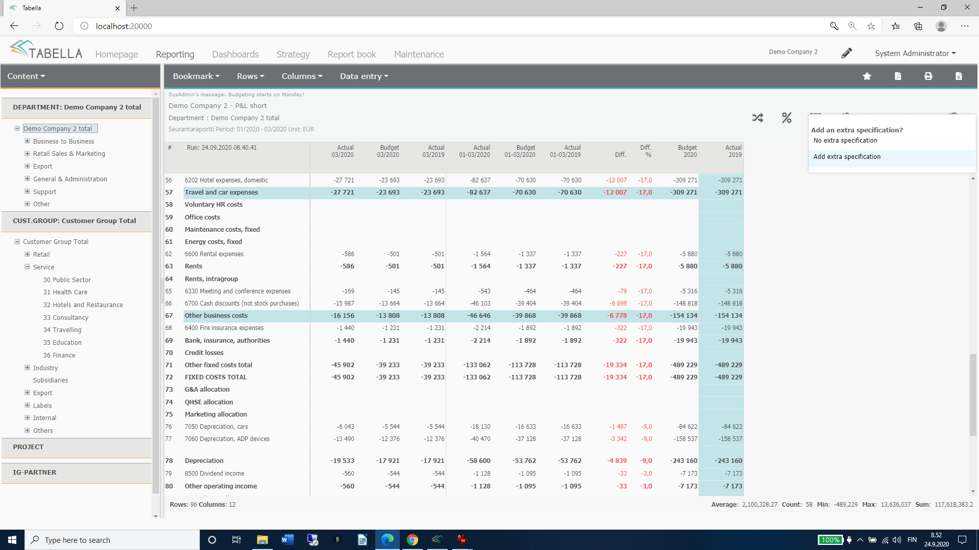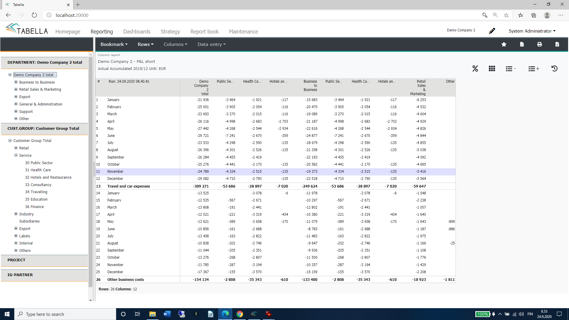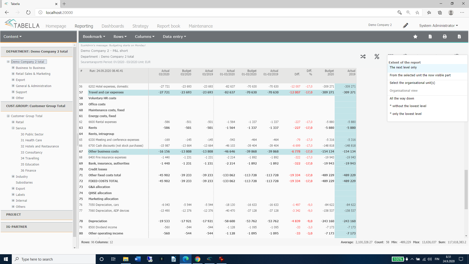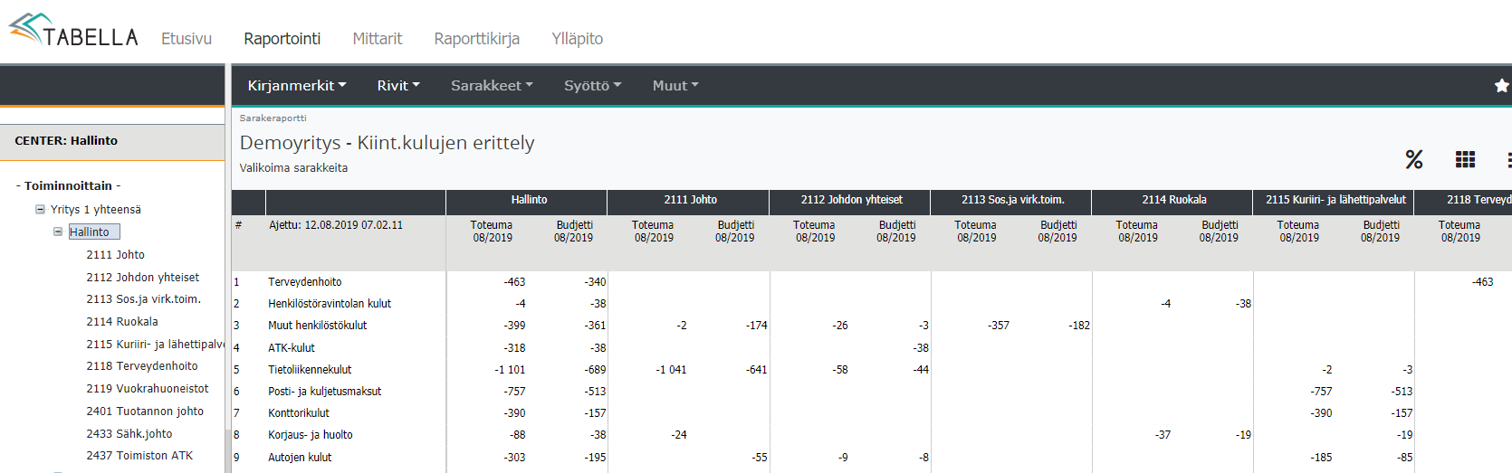 puurakenteen kaikki tasot ja kustannuspaikat näytetään rivi- / sarakeraportissa. |