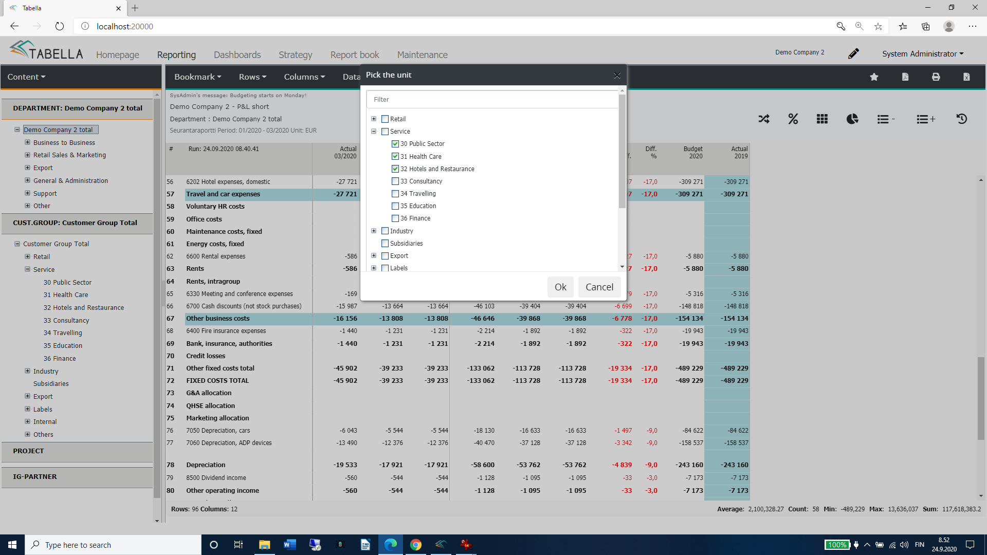 valitse puurakenteesta kustannuspaikat, joista raportti tehdään. Lopuksi paina Lataa valitut yksiköt valintaa. |