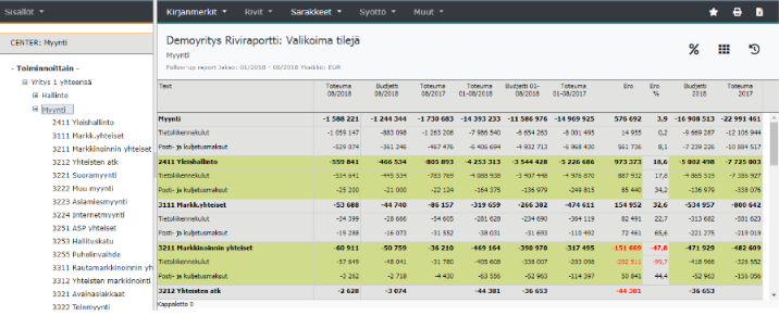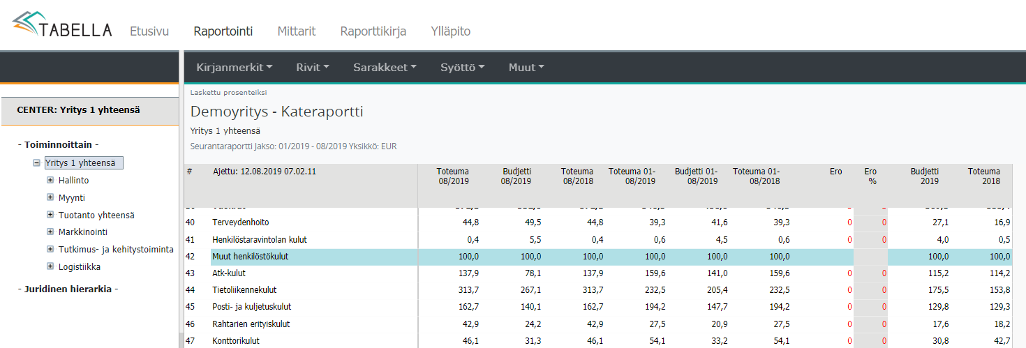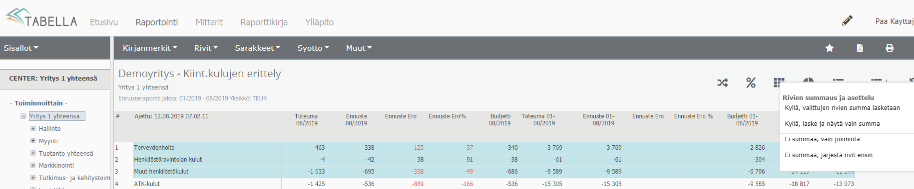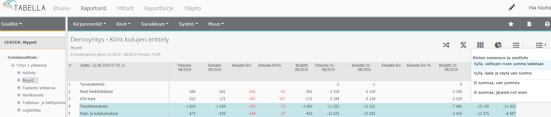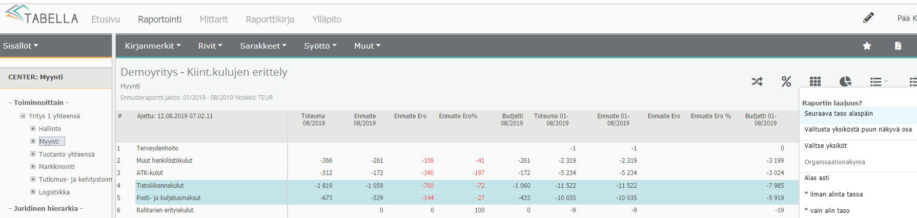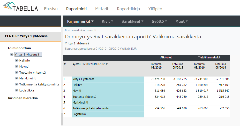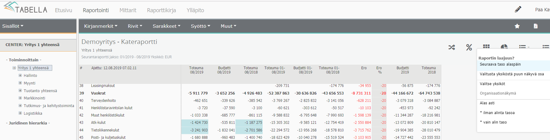Yritys yhteensä taso puurakenteesta. Rivimallina Kiinteiden kulujen erittely. Valitaan kaksi summariviä; ”ATK-kulut” ja ”Tietoliiikennekulut” sarakkesta Toteuma 08/2019 ja Toteuma 08/2018. Raportin laajuudeksi Seuraava taso alaspäin. Tällöin valituksi tulee Yritys yhteensä tason lisäksi seuraavat tasot eli kustannuspaikkaryhmät