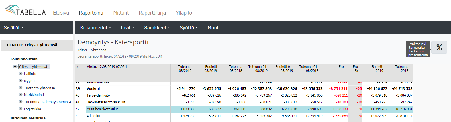 Tabella antaa valitsemallesi riville / sarakkeelle arvoksi 100 (%). Muut rivit tai sarakkeet lasketaan suhteutettuna siihen. Raportti muodostetaan painamalla painiketta
