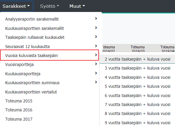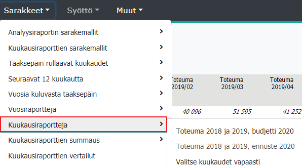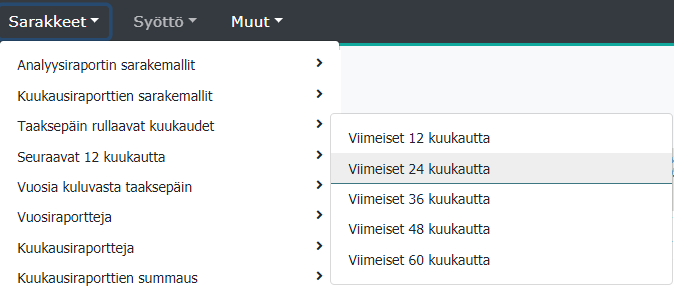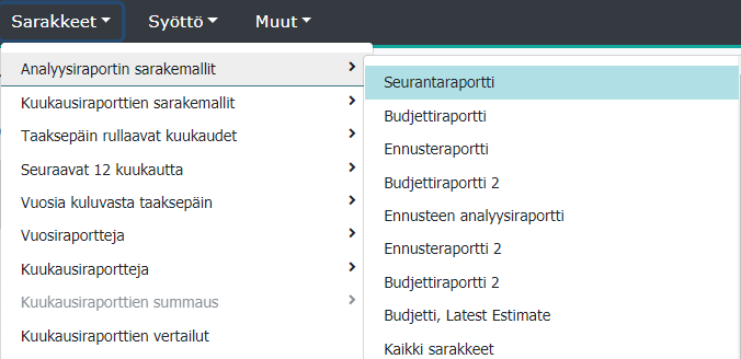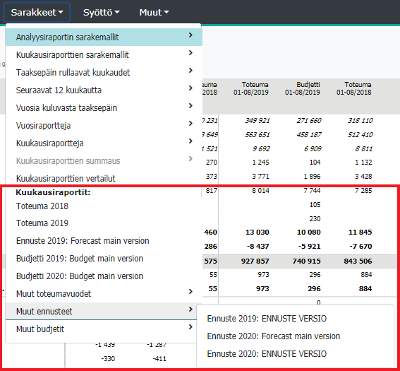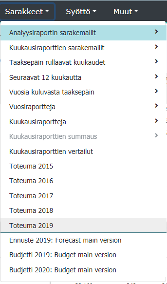 Sarakkeet-valikon lopussa on lista kuukausiraporteista, josta käyttäjä pääsee valitsemaan kuukausiraporteissa käytetyn aikajakson. Suoraan Sarakkeet-valikon avattua näkyy aikajaksoista toteuman osalta kuluva vuosi ja edellinen vuosi. Ennusteesta näkyy pääversio ja budjetista kuluvan vuoden ja valitun budjettivuoden pääversiot. Muut aikajaksojen versiot, kuten käyttöön määritellyt toteumavuodet ja budjetin / ennusteen käytössä olevat versiot löytyvät Sarakkeet-valikon lopusta, kuten alla olevasta näkyy: