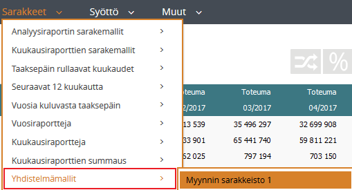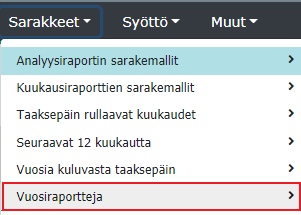Tabellaan luodut sarakemallit löytyvät Raportointi alueen Sarakkeet-valikosta. Tällä toiminnolla valitaan raportilla näytettävät sarakkeet eli yleisesti mitä eri aikajaksoja, kumulatiivisia summia, ero- tai indeksi-sarakkeita raportilla halutaan näyttää. Tabellan pääkäyttäjä voi määritellä lisää eri sarakemalleja Tabellan Ylläpito alueella kohdassa Sarakemallit.