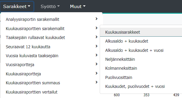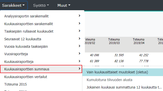 Kuukausiraportteja esitetään Tabellassa oletuksena muutoksina. Käyttäjällä on myös mahdollisuus kumuloida valittu kuukausiraportti valitsemalla Sarakkeet > Kuukausiraporttien summaus > Kumuloituna tilivuoden alusta.