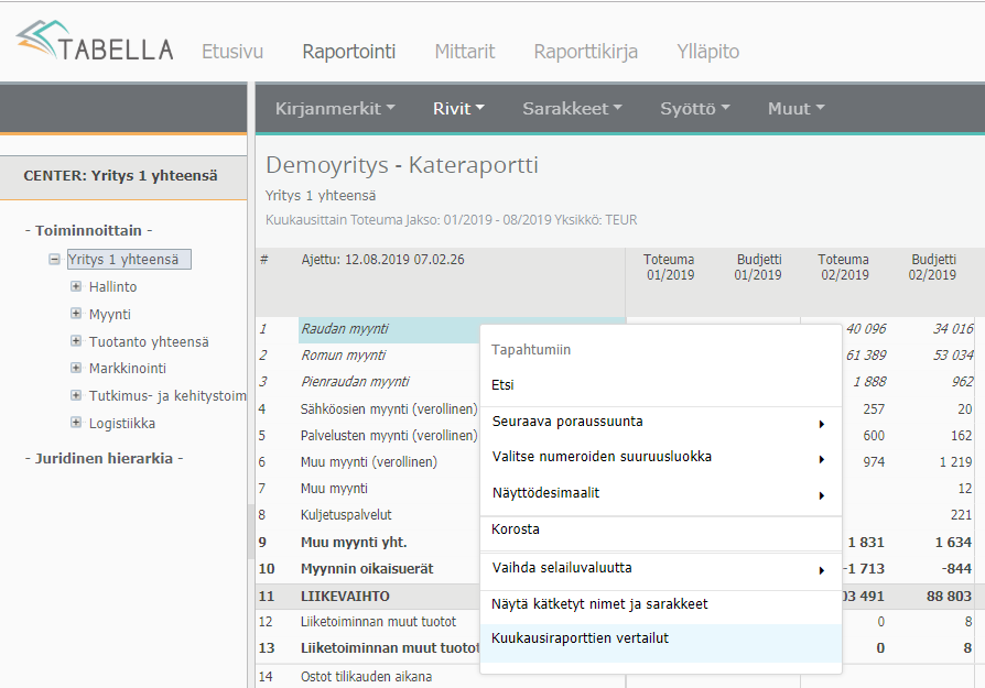 Kuukausiraporttien vertailussa kaikki toiminnot eivät ole käytössä. Voit kuitenkin vaihtaa organisaation tasoa puurakenteesta ja pystyt tekemään riviraportin. Sarakeraportti ei ole toimintona. Lisäksi rivimallin vaihto ja lyhyt / pitkä raporttimuoto on käytössä.