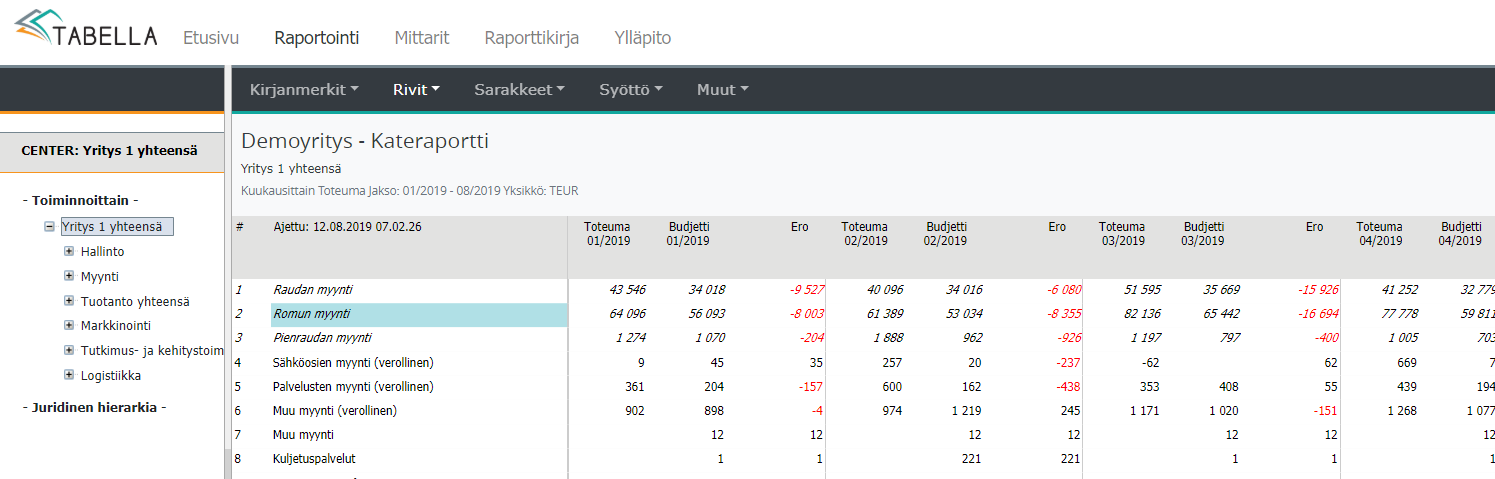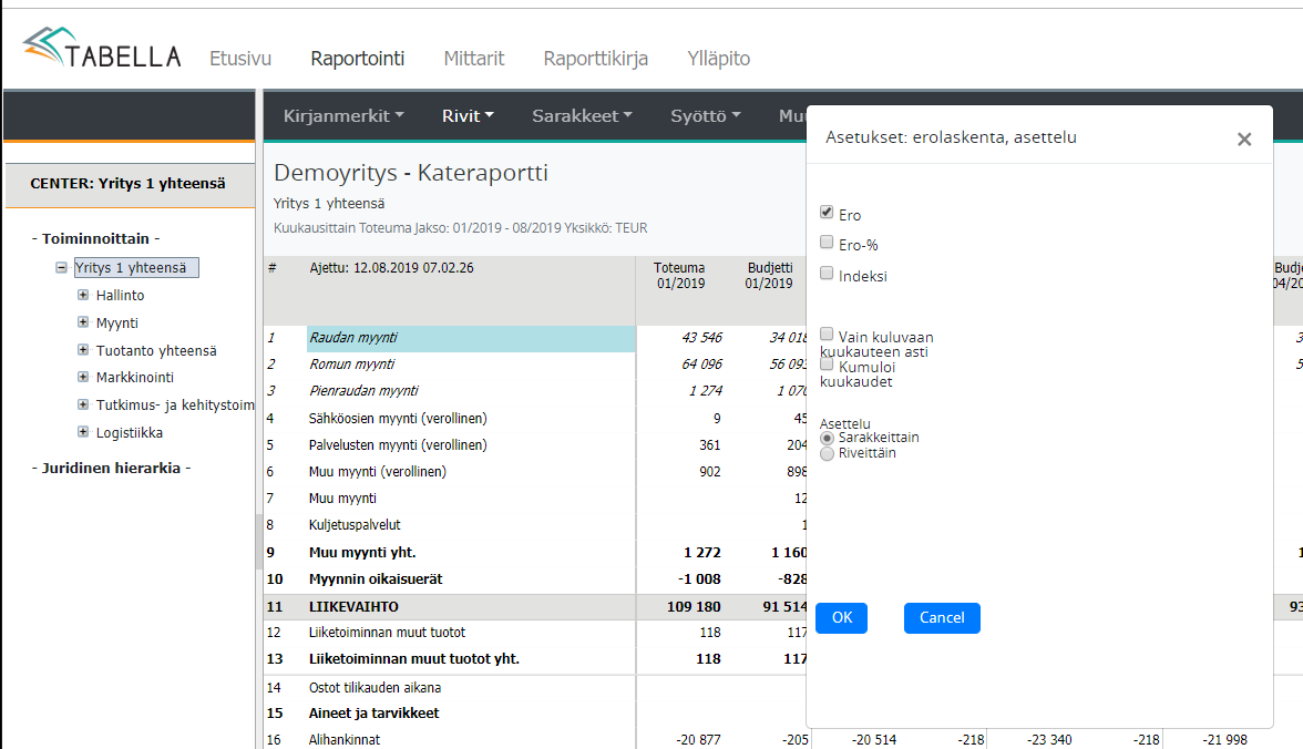 Alla olevassa esimerkissä vertailuun on valittu kaksi vuotta; Toteuma ja budjetti 2019, sekä näiden välinen ero.