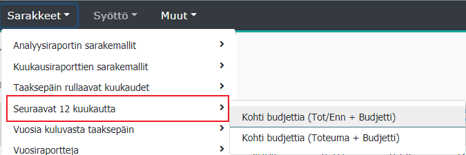 Seuraavat 12 kuukautta valinnalla kuukausisarakkeet valitaan kuluvasta kuukaudesta eteenpäin, jolloin loppuvuosi on joko budjettia tai ennustetta.