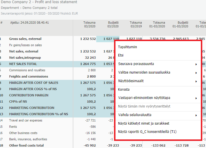 Tapahtumiin-valikosta päästään porautumaan valitusta solusta kirjanpidon tapahtumatasolle. Tästä lisää kohdassa Tapahtumaraportti.