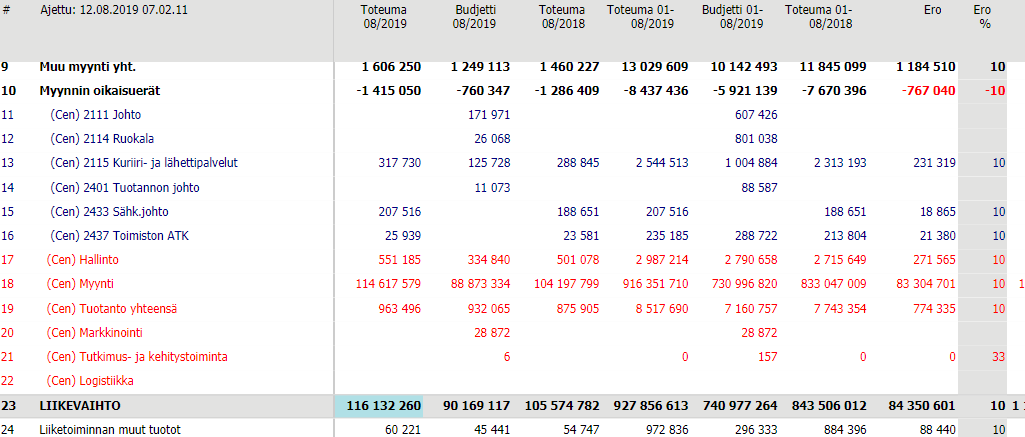Alla on esimerkki, jossa on porattu LIIKEVAIHTO rivistä kustannuspaikka edellä ja poratusta alueesta on porattu edelleen Hallinto-yksiköstä.