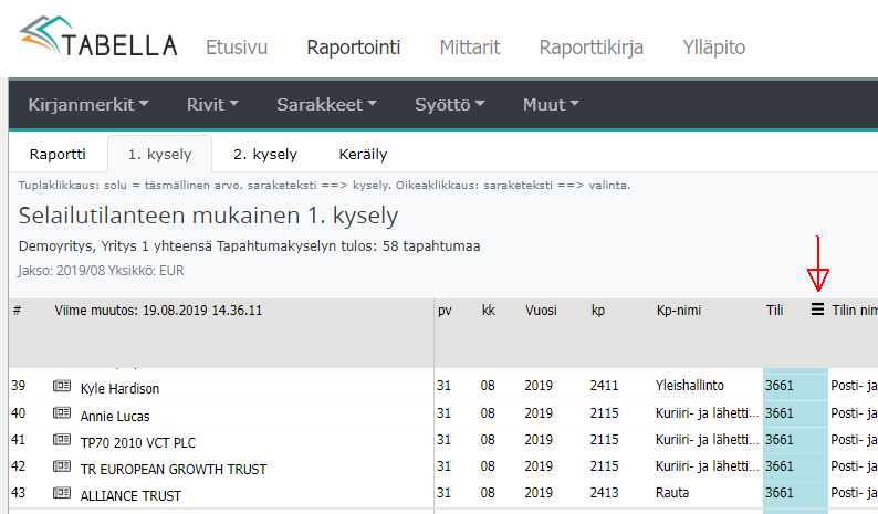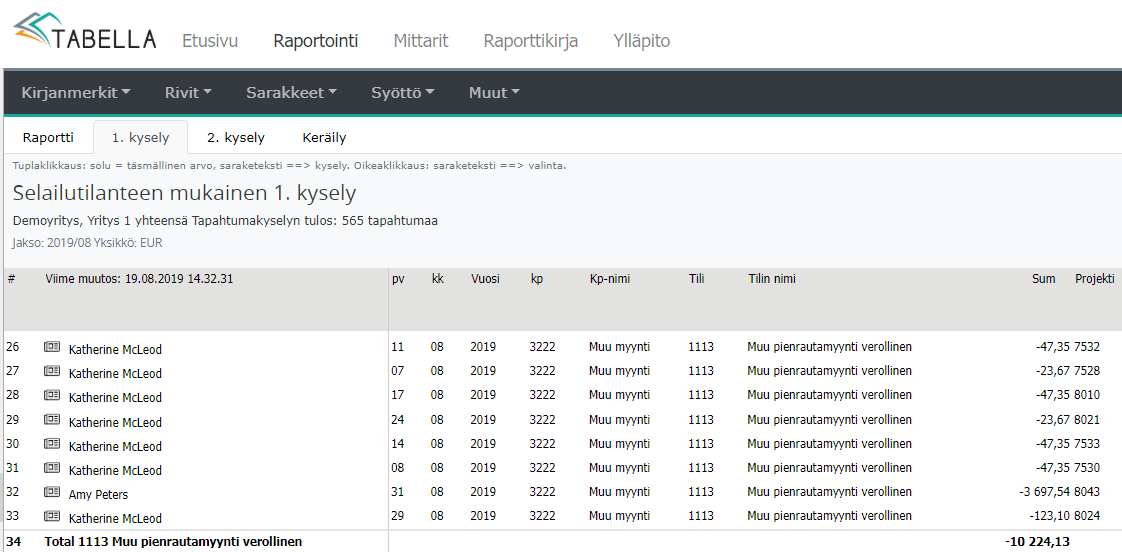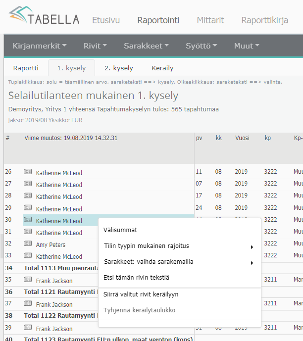 Tapahtumaraportilla (tunnetaan myös pääkirjan selailu) päästään selailemaan tapahtumia.
