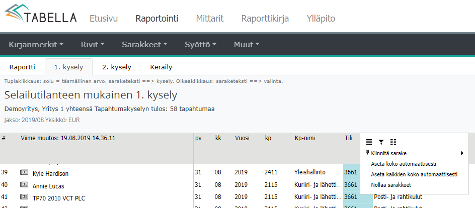 Valikosta pääsee asettamaan sarakkeen koon automaattisesti. Vaihtoehtoisesti valitun sarakkeen tai kaikkien sarakkeiden. Nollaa sarakkeet, palauttaa sarakkeiden oletuskoon.